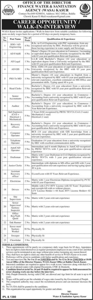 WASA Kasur invites applications for temporary positions on a daily wage basis. Walk-in interviews for roles such as Engineers, Clerks, and Sanitary Workers. Apply by February 23, 2026.