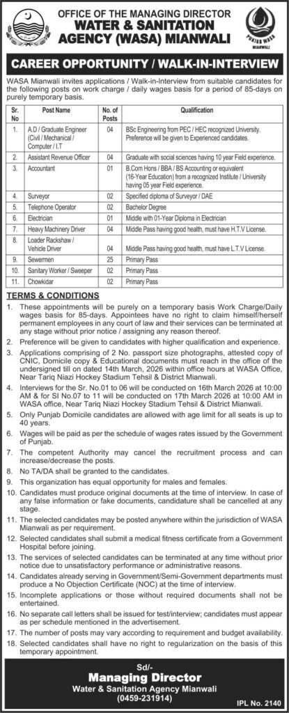 Apply for WASA Mianwali Jobs 2026 on work charge/daily wages basis. Vacancies for Graduate Engineer, Revenue Officer, Driver, Electrician, Sewer Man and more. Walk-in interview in March 2026. Punjab domicile required.