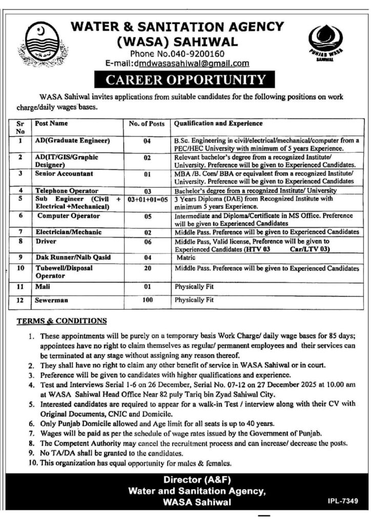 - Walk-in test/interviews will be held on 26th and 27th December 2025 at WASA Sahiwal Head Office.