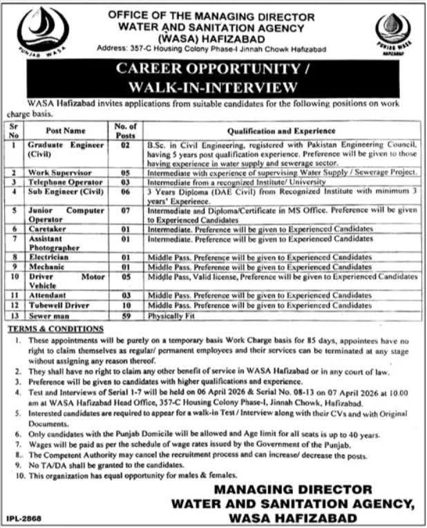 Candidates are required to appear in person for a walk-in test/interview at the WASA Hafizabad Head Office (357-C Housing Colony Phase-I, Jinnah Chowk, Hafizabad).