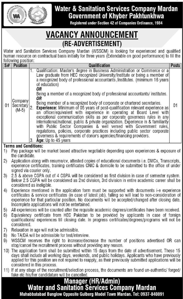 Apply for WSSCM Mardan Jobs 2026. Latest Company Secretary (M-5) vacancy in Water & Sanitation Services Company Mardan. Check eligibility, experience, deadline, and application process.