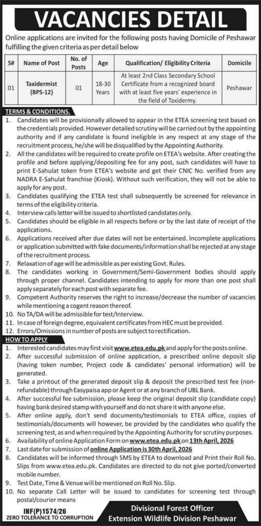 Apply for Taxidermist jobs in Wildlife Division Peshawar 2026. Extension Wildlife Division announces BPS-12 vacancy for Peshawar residents. Check eligibility, ETEA screening test details, and apply online by April 30, 2026.