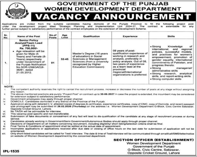The Women Development Department of Punjab is hiring a Senior Policy Analyst (Team Lead) for a strategic planning project. Apply by June 26, 2026.
