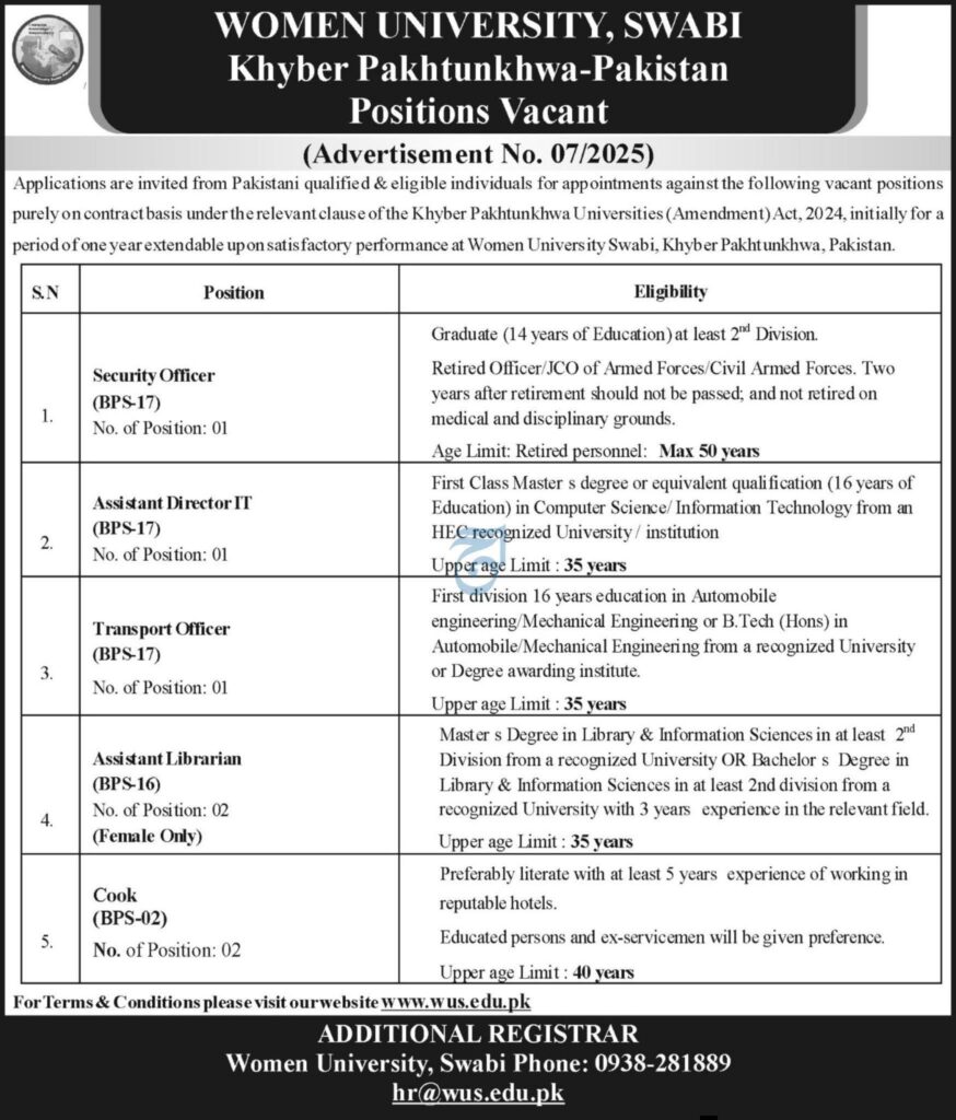 Apply for exciting job opportunities at Women University Swabi. Positions available for Security Officer, Assistant Director IT, Transport Officer, Assistant Librarian, and Cook. Ideal for qualified professionals seeking a career in academia and university administration. Explore contract-based roles with the potential for extension.