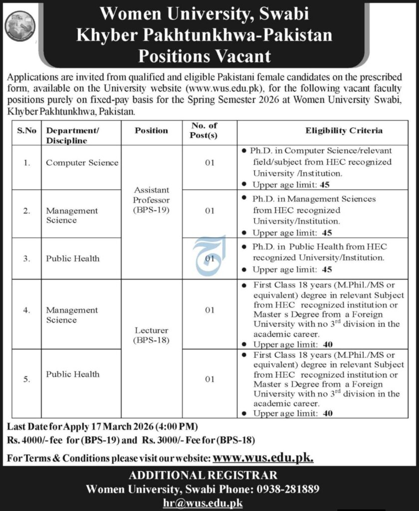 Women University Swabi Khyber Pakhtunkhwa is inviting applications from Pakistani female candidates for Assistant Professor and Lecturer positions in Computer Science, Management Science, and Public Health. Eligible applicants can apply before 17 March 2026.