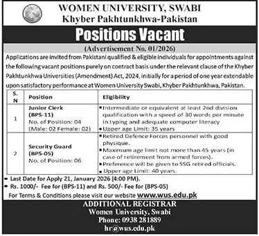 “Women University Swabi, Khyber Pakhtunkhwa, invites applications for Junior Clerk and Security Guard positions. Apply now for these contract-based roles. Candidates must meet the educational and experience criteria. Last date to apply is 21st January 2026.”